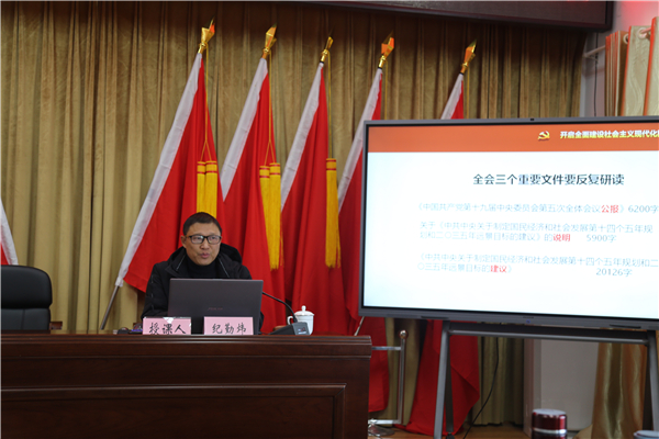 宣讲会上,纪勤炜紧紧围绕党的十九届五中全会精神,从回顾新发展成就、阐述新发展背景、立足新发展阶段、构建新发展格局和贯彻新发展理念五个方面,对党的十九届五中全会精神进行了深入细致的解读。