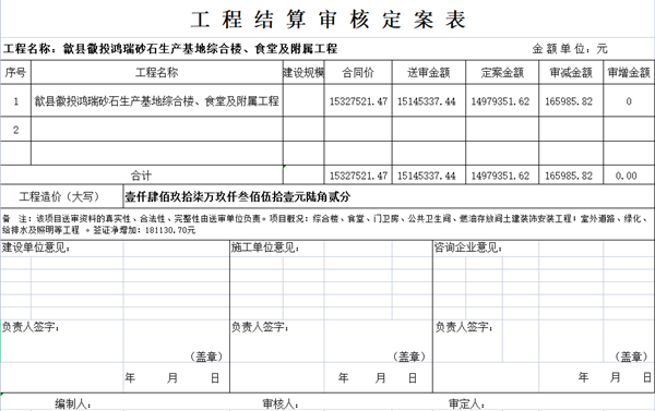 歙县徽投鸿瑞砂石生产基地综合楼、食堂及附属工程结算审核定案公示