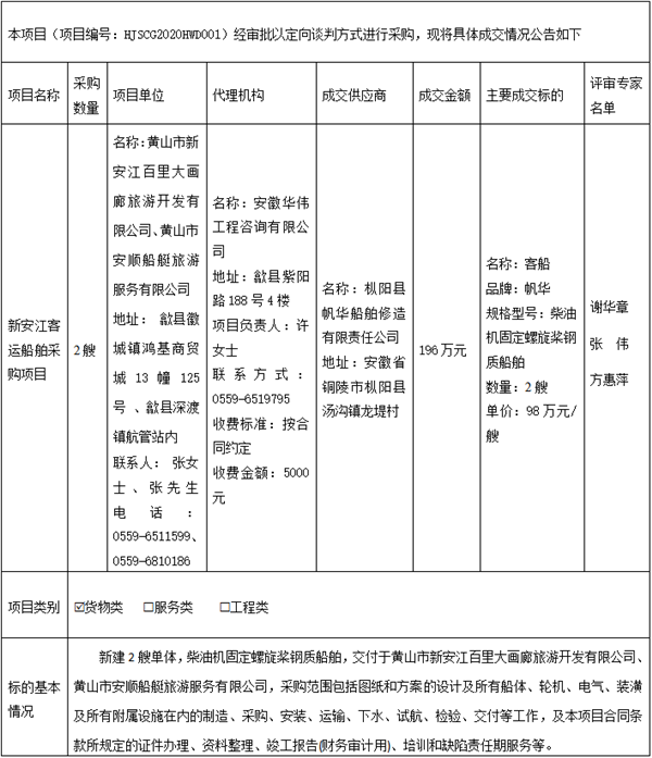 新安江客运船舶采购项目成交结果公告