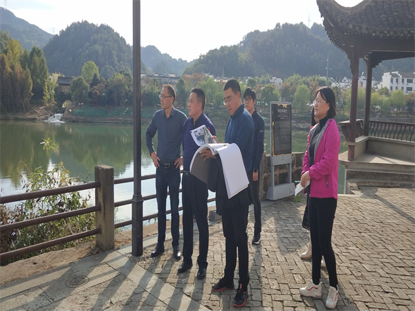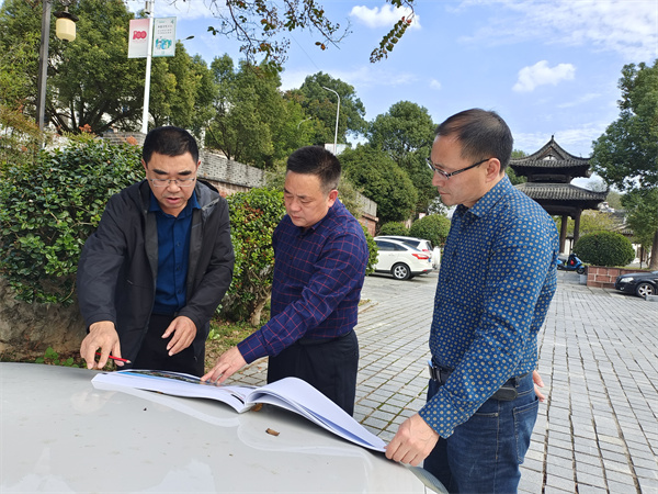 调研组一行从南门停车场步入渔梁古道,沿练江而下,过村头水口三角亭李白问津处,从古渡口经河边景观长廊到渔梁坝,又从百步阶梯而上回到渔梁老街,查看了景区入街口、收购的民宅和老房维修现场。在途经的各节点,调研组对照设计图结合实地街情斟酌细节风貌,并就整治提升愿景与当地居民进行积极交谈。