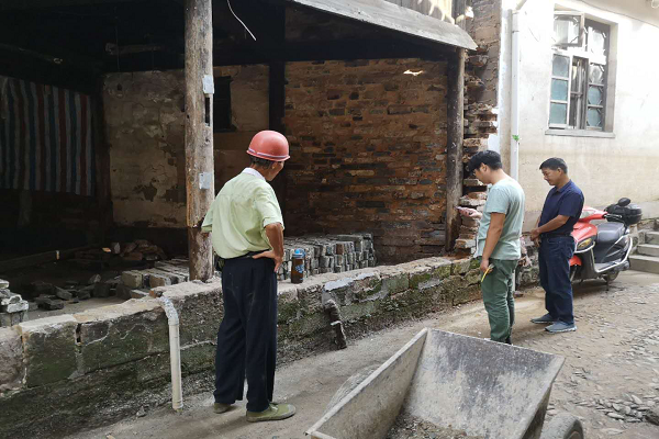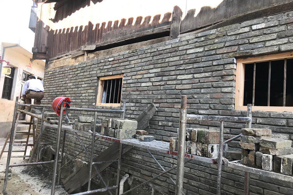 渔梁街155号受损最为严重,整个墙面被洪水冲毁,公司在不改变该房屋任何主体结构的基础上将其他已坍塌老旧房产的小青砖加以整合运用,重砌整体墙面,最大程度的保留了该房产原有的历史建筑风貌。